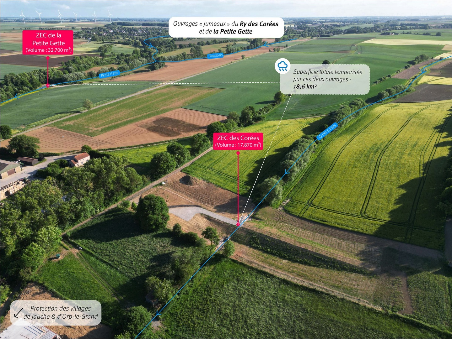 Il s'agit du deuxième ouvrage de lutte contre les inondations érigé dans la commune de l'est du Brabant wallon. Une première zone d'expansion de crue d'une capacité de 32.700 mètres cubes avait d'ores et déjà été érigée sur le territoire d'Orp-Jauche en vue d'absorber les eaux excédentaires de la Petite Gette. La ZEC inaugurée ce mardi pourra quant à elle retenir un volume d'eau de 18.000 mètres cubes, portant à 50.000 mètres cubes le volume de protection combiné des deux installations, de quoi mieux protéger les villages de Jauche et Orp-le-Grand, de même que les villages situés en aval.