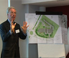 Vendredi 3 juin 2011Le Cercle du Lac va déménager! Ce cercle d'affaires né en 2005 à Louvain-la-Neuve n'a cessé de grandir. Il compte aujourd'hui 700 membres et se retrouve à l'étroit dans les salons de l'Aula Magna. Les nouveaux bâtiments seront construits au parc Einstein à la frontière avec Mont-st-Guibert. Le déménagement est prévu fin 2012. Présentation du nouveau projet: Pierre Thirion et Dominique Tournay.